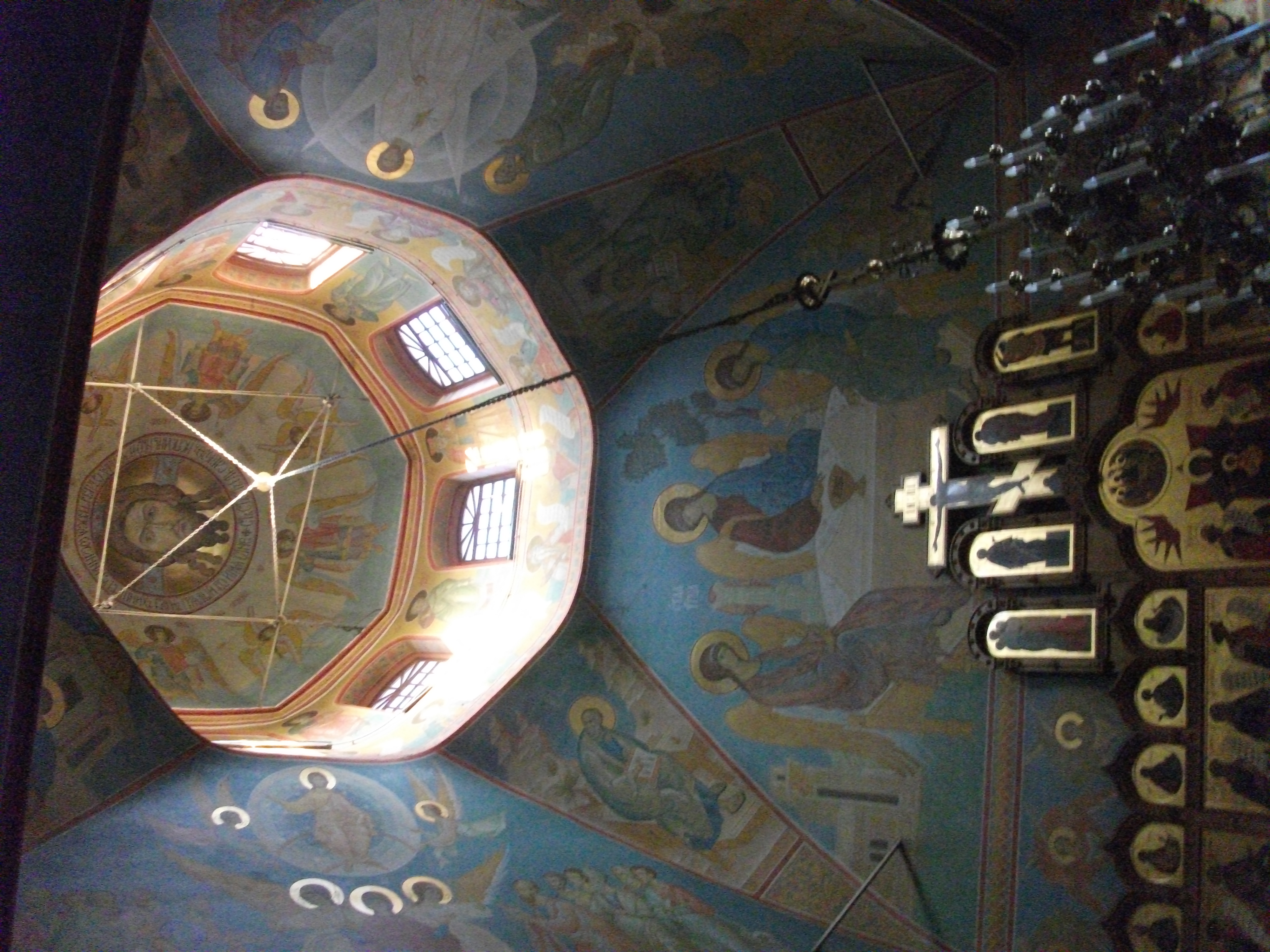 Looking up into one of the spires, the ceilings all have paintings of different saints