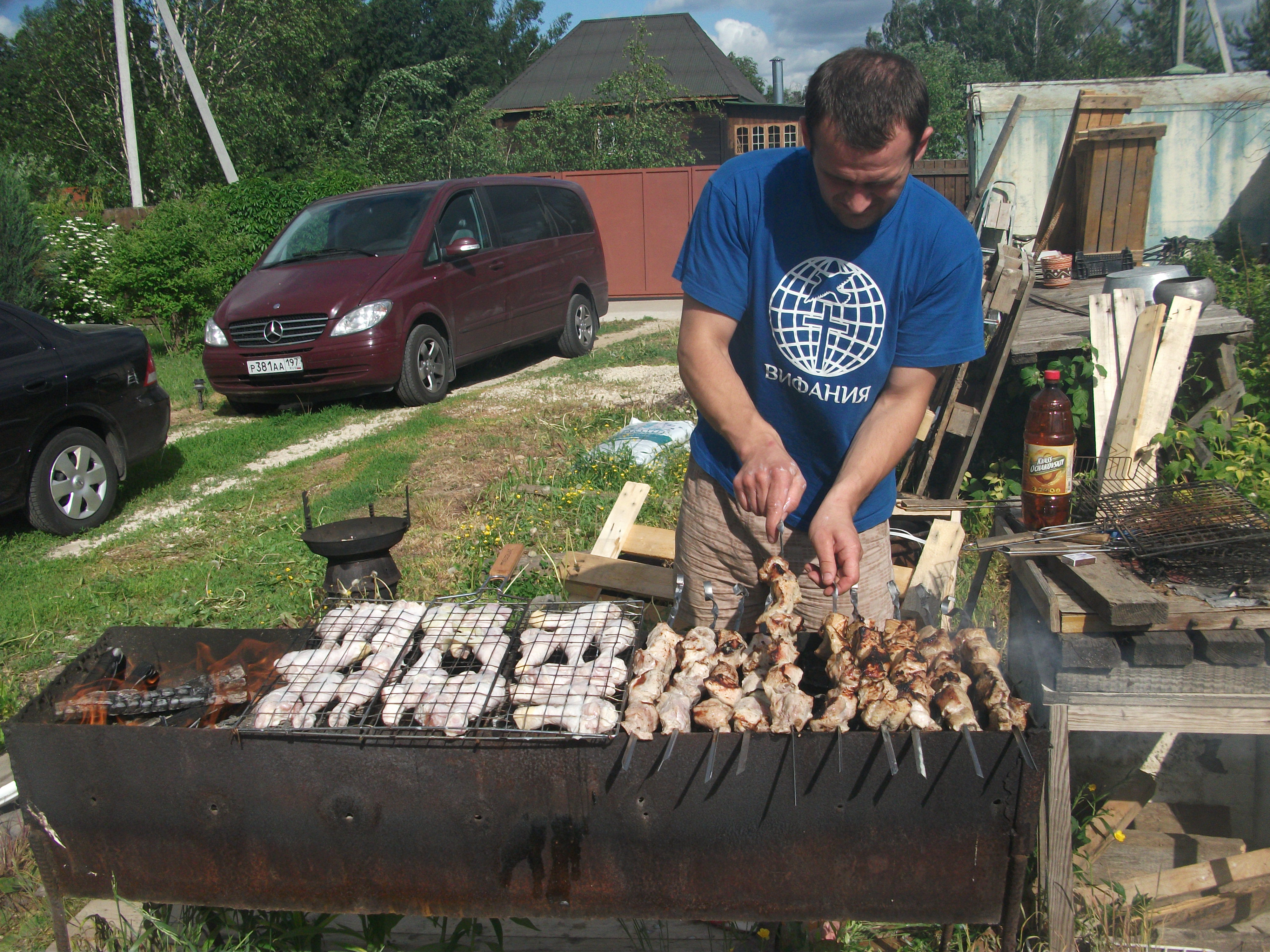 Chef Vanya preparing shashlik (grilled pork) and chicken legs