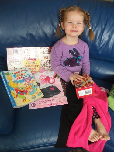 late birthday presents = presents = happy girl
