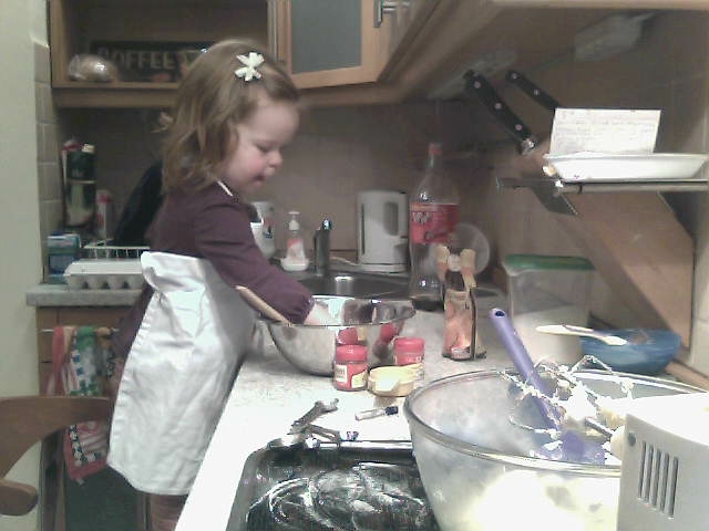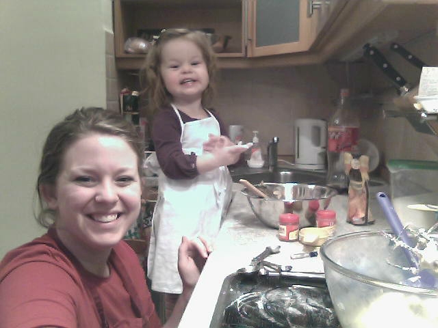 On Saturday, yesterday, I made two different kinds of cookies while Violet was napping, and I thought I might do the same thing today. But then I decided let Violet “help”, and she did really good! Other than the fact she was making a mess everywhere, she had lots of fun helping bake with mommy. (The pics aren’t that great because I was using our web cam, sorry!)